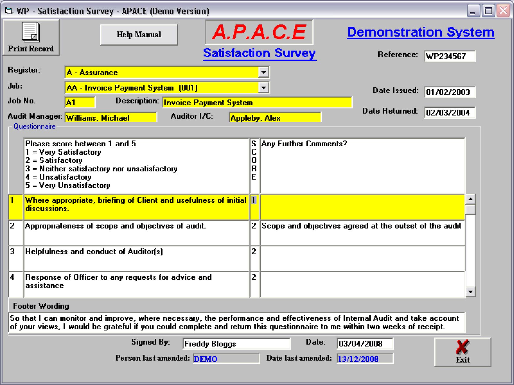 This routine will be used to print off and update the satisfaction survey for the selected job. The satisfaction survey must have previously been defined by the Administrator or this option will not be available in the working papers menu.