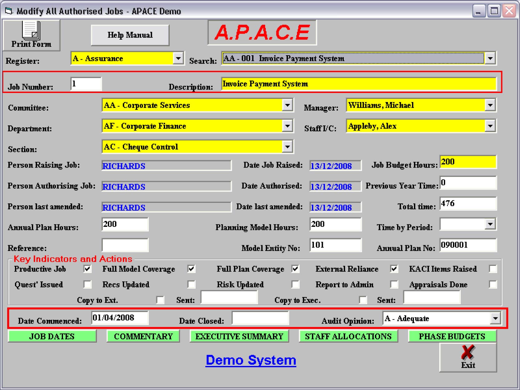 Subsequent modifications to these authorised jobs may change or add detail to the staff allocations, target dates etc. and progress the job through to job closure; adding actual dates and progress commentary, and, ultimately, the audit opinion and executive summary. Thereafter this historical job information is maintained within APACE indefinitely to allow you to review previous audit experience.