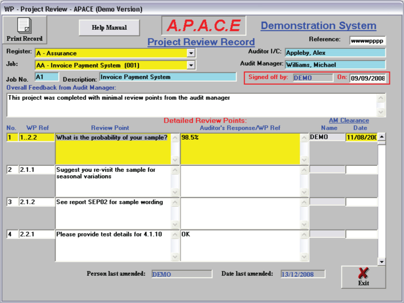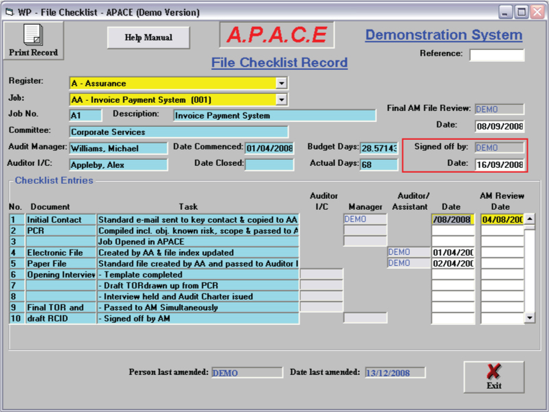 The file checklist will be designed by the APACE administrator. Checklists can then be raised, entered and signed-off for each job. Only designated staff will be able to amend the defined sign-off dates or even view this document.